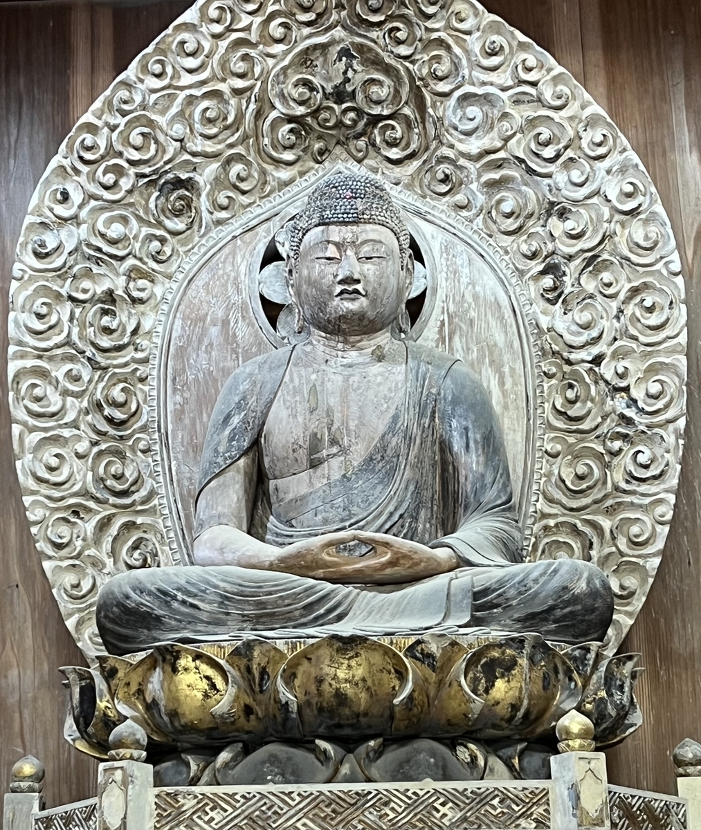 大きな仏殿の中央に、釈迦如来さまが正面を向いて坐しておられる。像高84.0cm。桧材による割り矧ぎ造り。この釈迦如来坐像は、後世の修理で別の部材を付け足されて太っちょになり、しかも、緑色になっていたのだが、平成に入って牧野先生が修復。当初部分だけに戻し、不足部分を新たに新調して付け足すことで、鎌倉仏の凛々しさが蘇った。その経緯も上記著書に詳しく書かれているので、ぜひお読みいただきたい。修理前や修理途中のカラー写真も豊富で、臨場感があり、手に汗握るレポートとなっている。